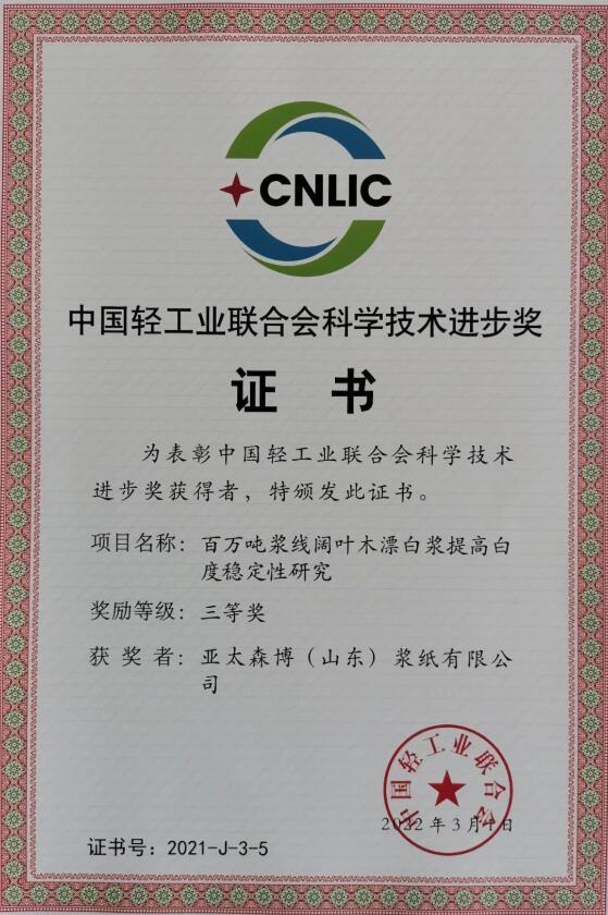 “中國輕工業聯合會科學技術獎”是由國家科學技術獎勵工作辦公室批準,由中國輕工業聯合會設立的最高輕工科技獎項,屬國家部級科技獎勵,旨在獎勵在我國輕工業領域的科學研究、技術創新與開發、科研成果推廣和實現高新技術產業化中做出突出貢獻的組織和個人。該獎項代表了中國輕工行業科技獎勵的最高級別,被認為是輕工業的“榮譽勛章”。 亞太森博是世界領先的漿紙纖垂直一體化企業、中國主要的商品木漿生產供應企業、山東造紙產業鏈的重要“鏈主”企業。近年來,公司持續加大科技研發投入,積極開展技術創新工作,大力推動產學研合作,充分發揮企業在行業轉型升級中的引領示范作用,通過技術創新推動企業轉型升級和高質量發展,同時促進行業的科技發展和技術進步。