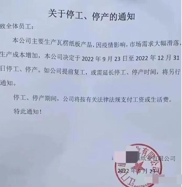 通知稱,公司主要生產瓦楞紙板產品,因疫情影響,市場需求大幅滑落,生產成本增加,公司決定于2022年9月23日至2022年12月31日期間停工、停產。 當然,這家企業在通知中也表示:“如公司提前復工,或需延長停工、停產時間,將另行通知。停工、停產期間,公司將按有關法律法規支付工資或生活費。” 眾所周知,紙板行業是一個利潤極其微薄的行業,很多時候為了維持工廠機器正常運轉,許多企業都會低價甚至虧本接單,直到旺季來臨。但今年不同往日,內需疲軟、外需腰斬的局面從年初持續至今,且難以看到盡頭,大批企業經營困難。 也正因此,盡管發布這份通知的企業是江門市某大型紙板廠,同時也是廣東某紙板巨頭的其中一個生產基地,也只能屈服現實,及時止損。以這家紙板廠的體量都要陷入如此境地,整個包裝行業的困境可見一斑。 從產業鏈上游看,造紙行業上半年凈利潤普遍下滑,有些紙企半年時間就虧損數千萬元。步入下半年后,幾乎每個月都能見到紙企停機函,部分紙企的單臺紙機的單次停機時間長達一個月甚至更長。無疑,今年將是紙企近年來業績最差的一年。 從產業鏈下游來看,終端企業也難言樂觀,面對疫情反復、全球經濟陷入低潮等等復雜因素下,很多企業的訂單斷崖式下跌,難以維持正常運轉。就在幾天前,東莞某企業就發布通知稱,從“9月9日起無薪放假,停工時間待定”。