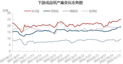數(shù)據(jù)來源:隆眾資訊 回顧近期市場,如上圖所示國產(chǎn)木漿市場價格雖無明顯波動,但進口現(xiàn)貨價格走勢承壓下行為主,市場供需矛盾較為突出。國際外盤價格再度下滑,俄羅斯伊利姆最新外盤報價針葉漿930美元/噸,較上輪下降20美元/噸;闊葉漿880美元/噸,較上輪下降10美元/噸。即便下調(diào)幅度并不大,但面臨漿價下行趨勢明顯,下游采購熱情明顯進一步受到抑制,繼續(xù)等待低價貨源出現(xiàn)。據(jù)隆眾資訊統(tǒng)計數(shù)據(jù)顯示,主流品牌針葉漿現(xiàn)貨價格在7300元/噸,較月初價格下滑2.01%;闊葉漿現(xiàn)貨價格6550元/噸,較月初價格下跌2.24%。隨著國內(nèi)現(xiàn)貨市場流通貨源量的增加,市場供應(yīng)偏緊局面逐漸緩解。另外人民幣對美元匯率開始反彈,進口成本降低在成本面的支撐有所減弱。 市場需求方面,下游紙企維持前期價格出貨為主,對于用漿量需求提升情況表現(xiàn)尚可。近日下游生活用紙企業(yè)再度發(fā)布漲價通知,另有個別企業(yè)進行輪流停機檢修,但從市場反饋情況來看,漲價落實存在一定難度,短期仍待觀察。從近期統(tǒng)計數(shù)據(jù)來看,白卡紙及文化用紙開工呈現(xiàn)增加趨勢,白卡紙隨著前期技改紙廠穩(wěn)定出紙行業(yè)產(chǎn)能利用率提升1.3個百分點。文化用紙方面,隨著疫情管控政策的優(yōu)化,企業(yè)生產(chǎn)及發(fā)運得以改善,行業(yè)產(chǎn)量有所提升。而生活用紙企業(yè)繼續(xù)保持中低位水平開工,特別隨著電商節(jié)結(jié)束,下游采購熱情有所減退。