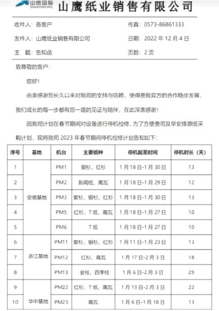 日前,山鷹紙業銷售有限公司公布了2023年春節停機檢修計劃。