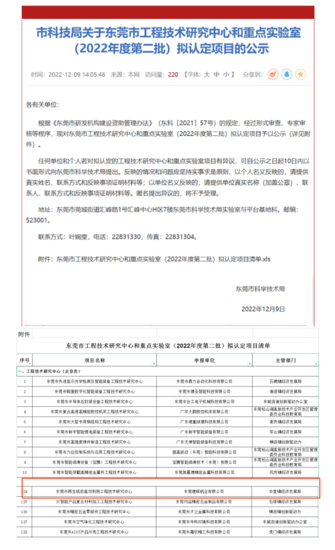 2022年12月9日,東莞市科學(xué)技術(shù)局官網(wǎng)發(fā)布了《市科技局關(guān)于東莞市工程技術(shù)研究中心和重點(diǎn)實(shí)驗(yàn)室(2022年度第二批)擬認(rèn)定項(xiàng)目的公示》,由東莞建暉紙業(yè)有限公司組建的“東莞市再生紙漿高效利用工程技術(shù)研究中心”成功通過認(rèn)定,建暉紙業(yè)的技術(shù)創(chuàng)新能力和研發(fā)實(shí)力又一獲得權(quán)威認(rèn)可。