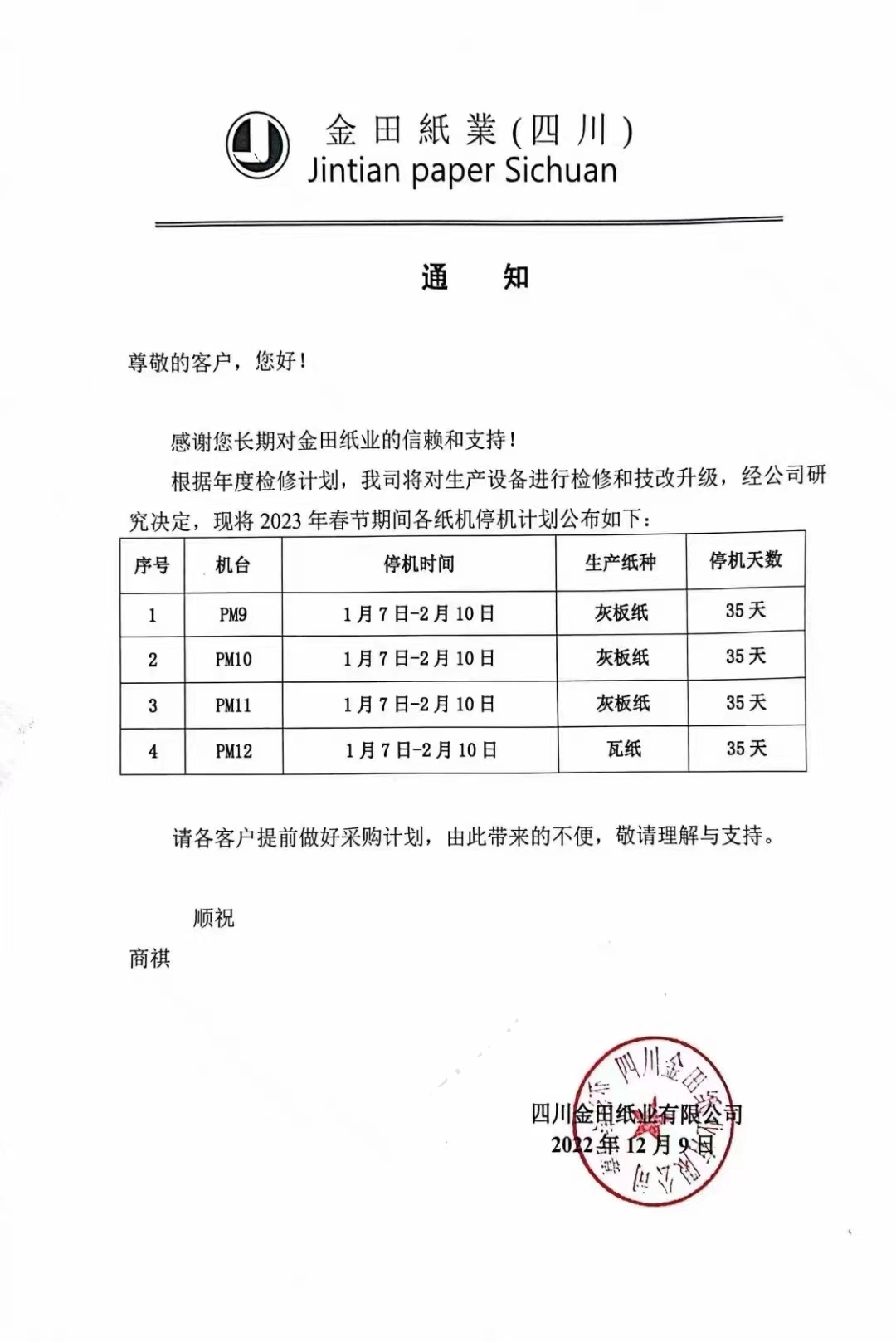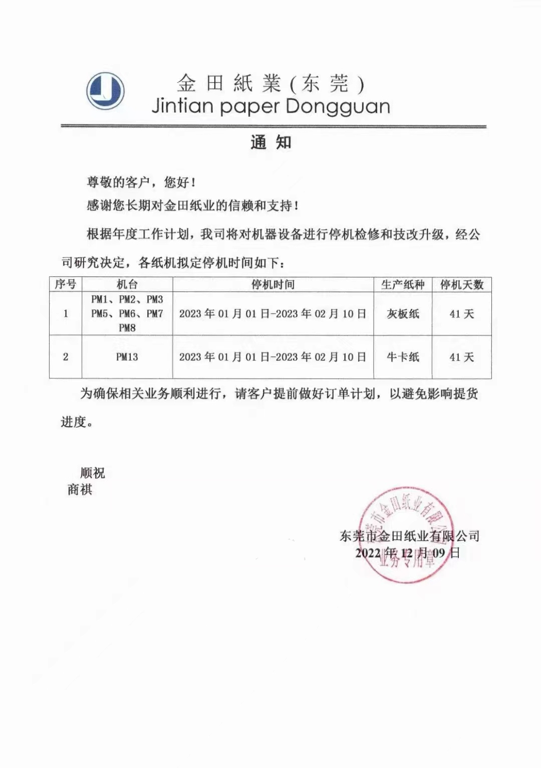 東莞市金田紙業有限公司成立于2003年,是一家現代化工業用紙造紙集團。公司位于東莞市萬江區大汾工業區,現有員工近2000人,主要生產灰板紙、瓦楞紙、紗管紙和涂布白板紙等產品。 此前,東莞市金田紙業還發布了停機通知,其PM1、PM2、PM3、PM5、PM6、PM7、PM8共七臺灰板紙機,以及牛卡紙機PM13均將在2023年1月1日-2023年2月10日停機41天。