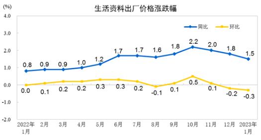 生活資料價格上漲1.5%,影響工業生產者出廠價格總水平上漲約0.35個百分點。其中,食品價格上漲2.8%,衣著價格上漲1.9%,一般日用品價格上漲1.2%,耐用消費品價格上漲0.3%。
