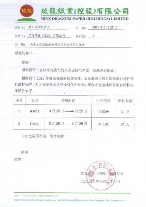 繼續停機!玖龍紙業又有多個生產基地宣布停機檢修。3月24日-3月25日,玖龍紙業東莞、太倉、天津三大基地最新的停機安排發布,共涉及15臺紙機,涵蓋瓦楞紙、牛卡紙、白卡紙、白板紙。此舉無疑在表明,玖龍紙業正在加大停機減產力度。