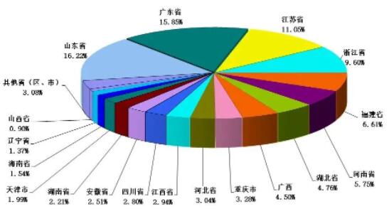 (2022年紙及紙板生產量區域布局圖) 2022年,山東省、廣東省、江蘇省、浙江省、福建省、河南省、湖北省、廣西壯族自治區、重慶市、河北省、江西省、四川省、安徽省、湖南省、天津市、海南省、遼寧省和山西省18個省(區、市)紙及紙板產量超過100萬噸,產量合計12043萬噸,占全國紙及紙板總產量的96.92%。