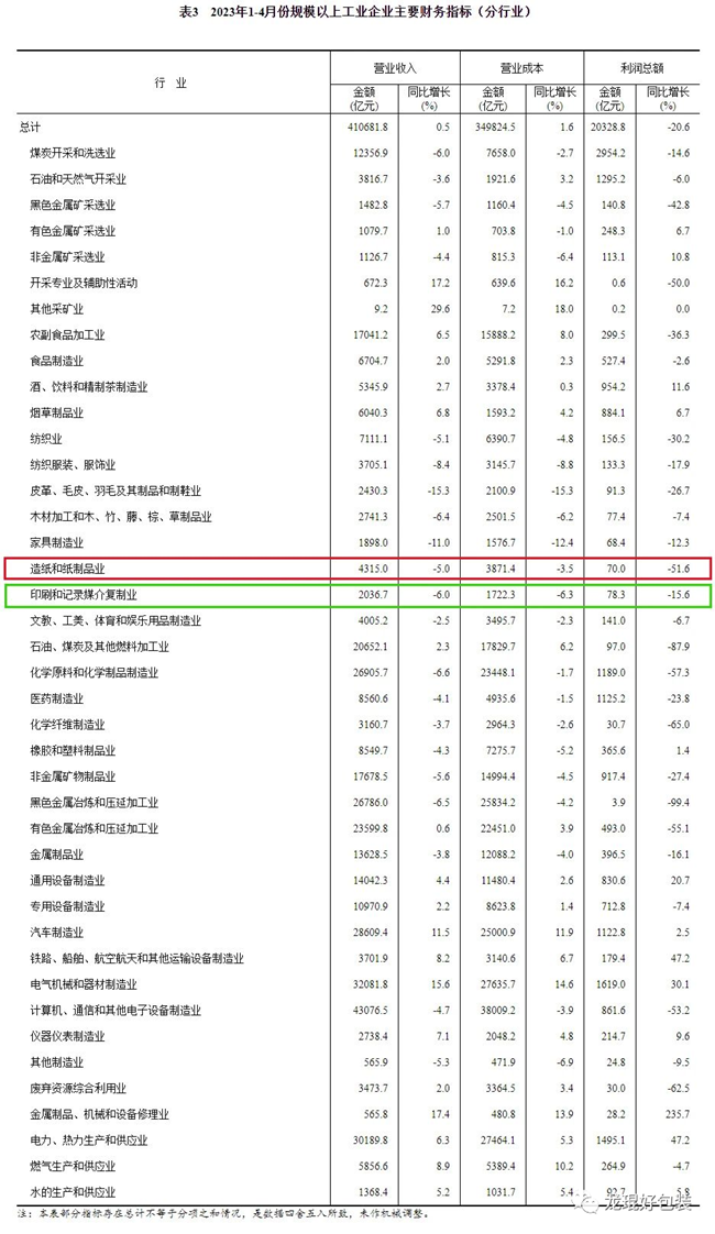 在41個工業(yè)大類行業(yè)中,13個行業(yè)利潤總額同比增長,1個行業(yè)持平,27個行業(yè)下降。其中,造紙和紙制品業(yè)實現(xiàn)利潤總額70.0億元,同比下降51.6%;印刷和記錄媒介復(fù)制業(yè)實現(xiàn)利潤總額78.3億元,同比下降15.6%。 在營業(yè)收入方面,2023年1-4月份,全國規(guī)模以上工業(yè)企業(yè)實現(xiàn)營業(yè)收入41.07萬億元,同比增長0.5%。其中,造紙和紙制品業(yè)實現(xiàn)營業(yè)收入4315.0億元,同比下降5.0%;印刷和記錄媒介復(fù)制業(yè)實現(xiàn)營業(yè)收入2036.7億元,同比下降6.0%。