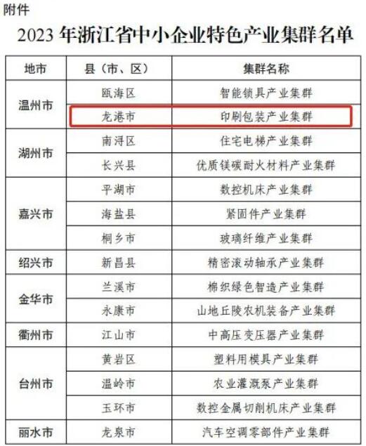 近日,浙江省經(jīng)濟(jì)和信息化廳公布了2023年浙江省中小企業(yè)特色產(chǎn)業(yè)集群名單,全省共15個產(chǎn)業(yè)集群入選。龍港市印刷包裝產(chǎn)業(yè)集群成功入選2023年浙江省中小企業(yè)特色產(chǎn)業(yè)集群。