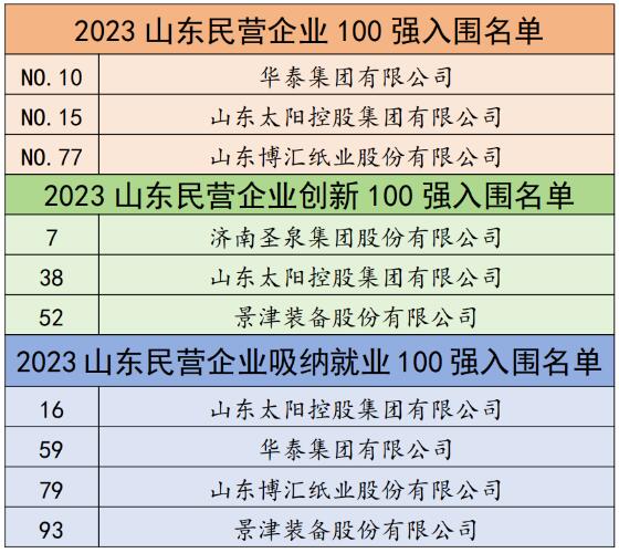 8月2日,2023年山東民營企業100強系列榜單發布會在德州召開。會上,發布了“2023山東民企100強”“創新100強”“創新潛力100強”“吸納就業100強”等榜單。其中,協會會員單位:華泰集團有限公司、山東太陽控股集團有限公司、山東博匯紙業股份有限公司入圍2023山東民營企業100強,山東太陽控股集團有限公司、濟南圣泉集團股份有限公司、景津裝備股份有限公司入圍2023山東民營企業創新100強,華泰集團有限公司、山東太陽控股集團有限公司、山東博匯紙業股份有限公司、景津裝備股份有限公司入圍2023山東民營企業吸納就業100強。協會代表全體會員向以上企業表示熱烈祝賀!