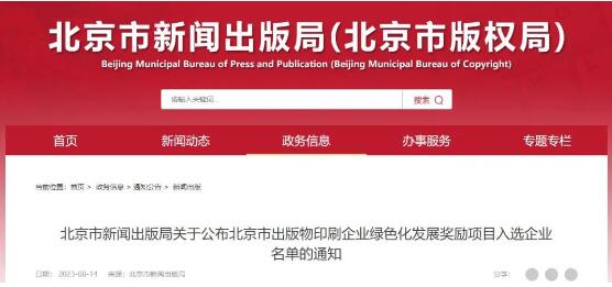近日,北京市新聞出版局網站公布了北京市出版物印刷企業綠色化發展獎勵項目入選企業名單。具體如下: