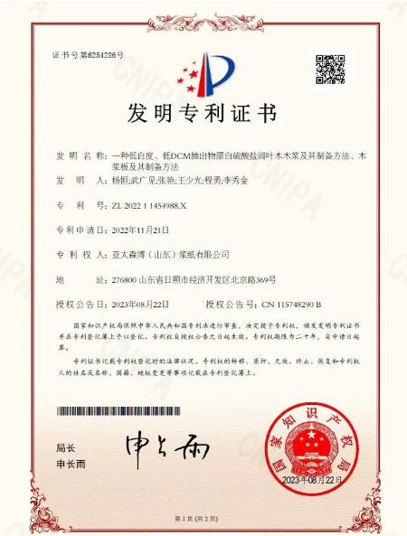 8月22日,亞太森博(山東)漿紙有限公司申請(qǐng)的發(fā)明專利ZL202211454988.X《一種低白度、低DCM抽出物漂白硫酸鹽闊葉木木漿及其制備方法、木漿板及其制備方法》順利通過(guò)國(guó)家知識(shí)產(chǎn)權(quán)局審查并獲得授權(quán)。