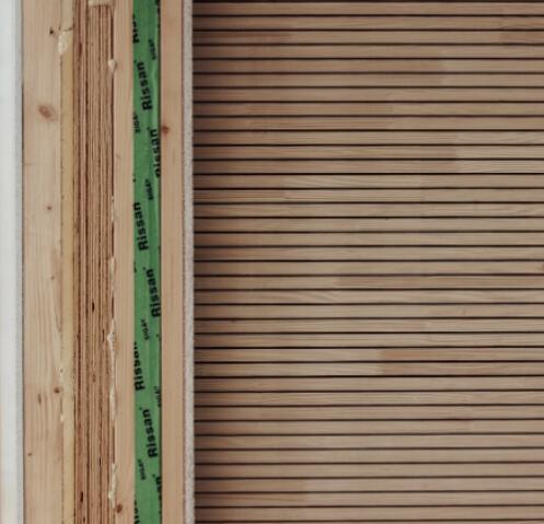 過梁仰視圖:L形構造中使用Kerto LVL讓過梁和天花板處于同一水平。 照片來源:Holzhaus Fabrik 減少材料、成本和負荷 Kerto LVL異常堅固和高效,因此減少了材料消耗。根據Holzhaus Fabrik的計算,與傳統方法相比,采用Kerto LVL制造的低過梁可以節省高達20%的成本。由于優化了材料的使用和更窄的壁厚,構件的總重量更輕,尺寸也更小。這意味著每臺運輸工具的裝載量增加,同時可以減少施工現場所需起重機的容量和占地面積。這對成本也有積極影響。 高質量標準 最后,Kerto LVL的窗過梁也給人留下了深刻的印象。該材料干燥不收縮、不沉降。由于使用較少的垂直木材,因此通常沉降較少。如果沉降導致裂縫,也會帶來視覺問題。這是因為單板層結構減少了垂直木材的用量。當過梁在施工現場上被制成L形構造時,氣密層的施工也得到了簡化。傳統氣密膜采用粘貼的方式安裝,樓面系統位于頂部,氣密膜采用環回式設計,該過程對于角落的細節來說特別復雜。 Kerto LVL使過梁構造對安裝人員更加有效和安全。同時,它是一種現代解決方案,可滿足建筑師和建筑商的設計和功能需求。
