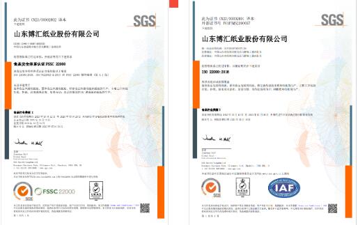 山東博匯紙業(yè)股份有限公司在今年5月份取得FSSC22000&ISO22000兩項食品安全體系證書后,于今年9月份在證書原有認(rèn)證范圍基礎(chǔ)上,對食品包裝用淋膜紙和紙板的生產(chǎn)與銷售進(jìn)行了擴項認(rèn)證,并順利通過。