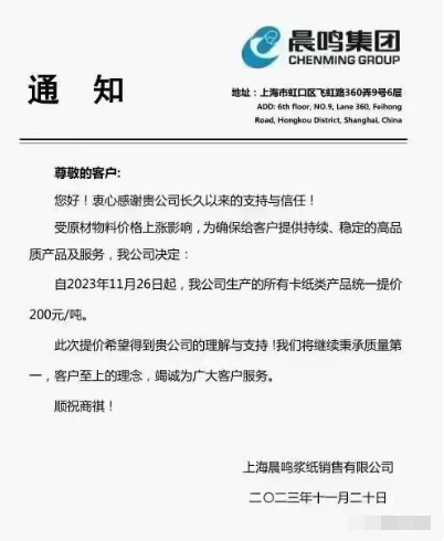 上海晨鳴漿紙銷售有限公司:自2023年11月26日起,我公司生產的所有卡紙類產品統一提價200元/噸