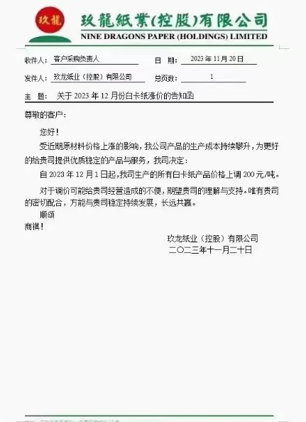 萬國紙業太陽白卡紙有限公司:自2023年11月26日起,我公司生產的全系列產品在目前執行價格基礎上統一漲價200元/噸