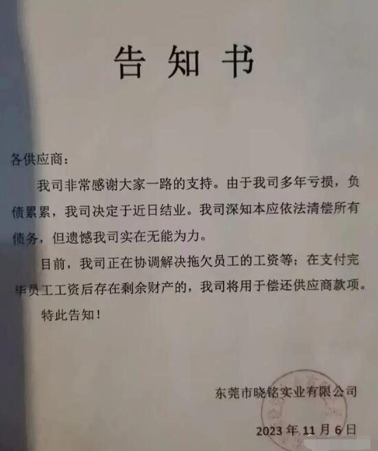 日前,東莞市曉銘實業(yè)有限公司發(fā)布通知稱:“由于公司多年虧損,負債累累,決定于近日結(jié)業(yè)。公司深知本應(yīng)依法清償所有債務(wù),但遺憾實在無能為力”。