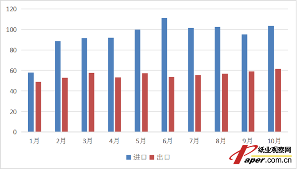其中,10月份,我國機制紙及紙板當(dāng)月進口量為103.48萬噸,與去年同期的71.07萬噸相比,增長45.61%。當(dāng)月出口量為61.62萬噸,與去年同期的50.24萬噸相比,增長了22.66%。