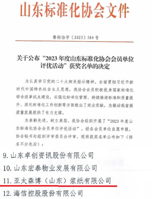 2023年12月29日,山東標(biāo)準(zhǔn)化協(xié)會(huì)公布了“2023年度山東標(biāo)準(zhǔn)化協(xié)會(huì)會(huì)員單位評(píng)優(yōu)活動(dòng)”的評(píng)選結(jié)果。亞太森博(山東)漿紙有限公司被評(píng)選為“2023年度山東標(biāo)準(zhǔn)化協(xié)會(huì)優(yōu)秀會(huì)員單位”。