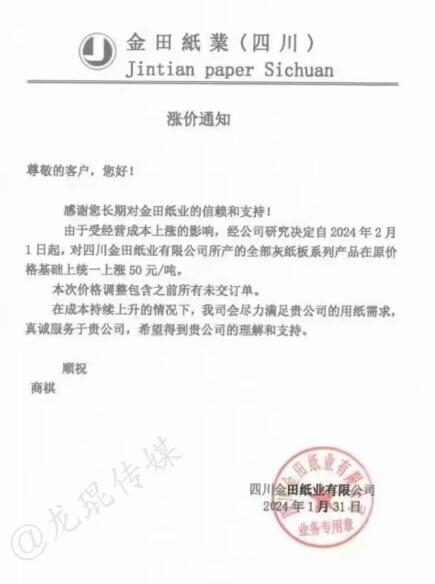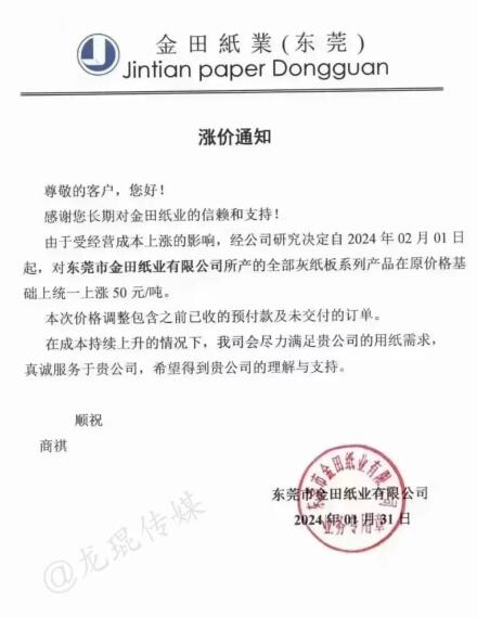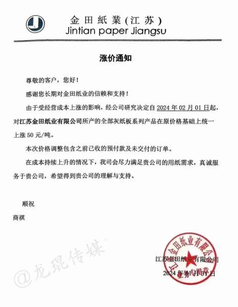 1月31日,金田紙業發布了最新的灰板紙漲價函。