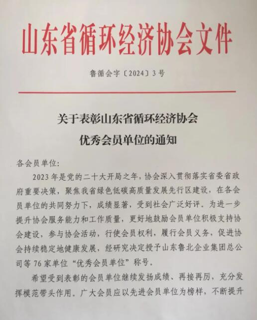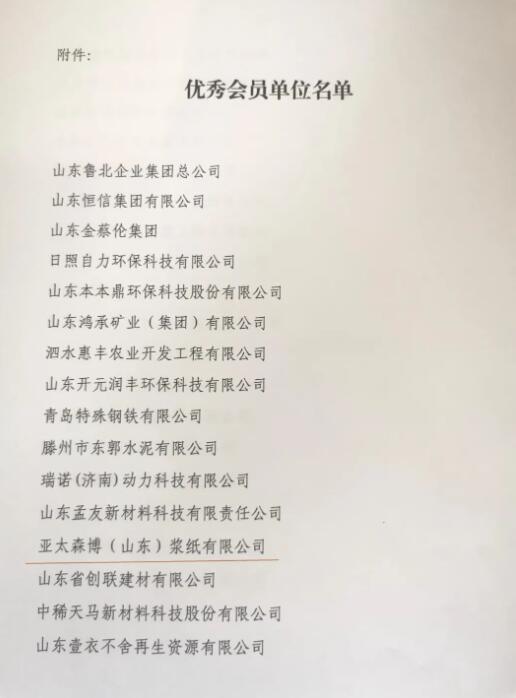 1月30日,山東省循環經濟協會公布了優秀會員單位的評選結果。亞太森博(山東)漿紙有限公司被評選為“2023年度山東省循環經濟協會優秀會員單位”。