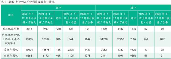 概述 1.國家統計局發布 2023年國民經濟回升向好,高質量發展扎實推進。2023年,面對復雜嚴峻的國際環境和艱巨繁重的國內改革發展穩定任務,在以習近平同志為核心的黨中央堅強領導下,各地區各部門認真貫徹落實黨中央、國務院決策部署,堅持穩中求進工作總基調,完整、準確、全面貫徹新發展理念,加快構建新發展格局,全面深化改革開放,加大宏觀調控力度,著力擴大內需、優化結構、提振信心、防范化解風險,我國經濟回升向好,供給需求穩步改善,轉型升級積極推進,就業物價總體穩定,民生保障有力有效,高質量發展扎實推進,主要預期目標圓滿實現。 從經濟增長上看,2023年我國GDP超過126萬億元,增速比2022年加快2.2個百分點。分季度看呈現前低、中高、后穩的態勢,向好趨勢進一步鞏固。按照可比價計算,2023年經濟增量超過6萬億元,相當于一個中等國家一年的經濟總量。人均國內生產總值穩步提高,2023年達到8.9萬元,比上年增長5.4%;從物價上看,物價總體保持溫和上漲,全年CPI上漲0.2%,核心CPI上漲0.7%。 2.海關統計數據的總體狀況 2023年1—12月,一般貿易出口2.2萬億美元,同比下降2.9%,進口1.7萬億美元,同比下降4%。從國際收支看,全年貨物出口增長0.6%,年末外匯儲備超過3.2萬億美元。 中國印刷及設備器材進出口數據 1.印刷設備 2023年1—12月印刷設備進出口數據如表1所示。