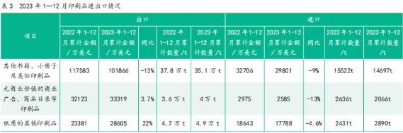 (1)版材 1)PS版 2023年1—12月,出口PS版3420萬m2,金額1億美元,金額同比下降25%。其中,出口韓國數量最大,960萬m2,金額也最高,為2579萬美元。出口金額其次為孟加拉國、印度和土耳其。 2022年同期出口4590萬m2,金額1.4億美元。 與出口相比,PS版進口數量和金額均較少。 2)CTP版 2023年1—12月,出口CTP版1.86億m2,金額5.8億美元。其中出口荷蘭金額最高,8411萬美元,2000萬m2;其次為韓國,2032萬m2,金額5965萬美元;印度1279萬m2,3868萬美元;土耳其957萬m2,2838萬美元。 相對于CTP版出口,CTP版的進口數量和金額都較少。 3)柔性印刷版 2023年1—12月,進口柔性印刷版62.9萬m2,金額3178萬美元。進口柔版主要來自發達國家。進口數量最多的來源國是德國和日本,兩國進口數量相加為45.6萬m2,占總進口數量的73%。 2023年1—12月,出口柔性印刷版65.6萬m2,金額2390萬美元。從數量和金額來看,第一大出口目的國是俄羅斯,16萬m2,金額549萬美元;其次為越南、印度、比利時和印度尼西亞。 (2)油墨 1)黑色印刷油墨 2023年1—12月,進口黑色油墨1633t,金額5157萬美元。其中,從日本進口數量最多,為621t,金額2141萬美元,數量約占總進口量的38%;其次為英國、新加坡、韓國、德國、法國和美國。 2023年1—12月,出口黑色油墨3731t,金額1747萬美元。其中,出俄羅斯最多,412t,金額279萬美元;其次是印度尼西亞,393t,金額178萬美元。 2)其他印刷油墨 2023年1—12月,進口其他印刷油墨6377t,金額2.1億美元。進口數量最大的來源國為日本,1610t,占總進口數量的1/4,金額7290萬美元,占總進口金額的1/3。從瑞士進口了119t,金額3111萬美元,金額排名第二。從韓國進口943t,2314萬美元,金額排名第三。 2023年1—12月進口數量同比減少了775t,金額卻增加了748萬美元。 2023年1—12月,出口其他印刷油墨3.2萬t,1.5億美元其中,從金額上看出口俄羅斯最多,1920萬美元,2246t;其次為越南,1627萬美元,4131t;印度尼西亞1185萬美元,2738t。 (3)水性噴墨墨水 2023年1—12月,出口水性噴墨墨水3.7萬t,金額2.6億美元,金額同比增長9%。出口金額最大的市場是印度,6222t,3092萬美元;巴基斯坦第二,4393t,2426萬美元;排名第三的是印度尼西亞,2247t,1735萬美元;美國第四,1146t,1459萬美元;泰國第五,1650t,1436萬美元。 2023年1—12月,進口水性噴墨墨水5400t,金額1.3億美元。其中,從馬來西亞進口最多,1815t,6336萬美元,占總進口金額的一半;其次是日本,1398t,2971萬美元。 3.印刷品 2023年1—12月印刷品進出口數據如表3所示。