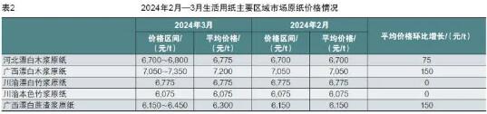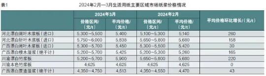 據《生活用紙》雜志調研數據,2024年3月各類紙漿原料平均價格相較2024年2月,總體呈上漲趨勢,部分種類紙漿平均價格漲幅較大,例如河北漂白闊葉木漿板(進口)、川渝漂白竹漿板均超過了200元/t。