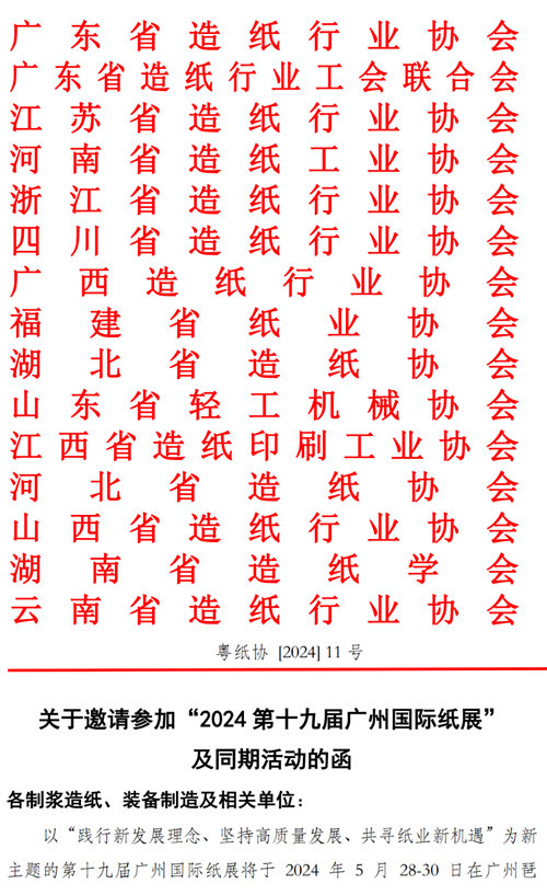 本次展會由廣東省造紙行業協會、廣東省造紙行業工會聯合會聯合江蘇、河南、浙江、四川、廣西、福建、湖北、江西、河北、山西、湖南、云南等省(區)造紙協(學)會及山東省輕工機械協會共同主辦,誠邀各會員單位、造紙及相關企業派員前來參展參觀。