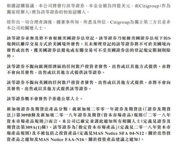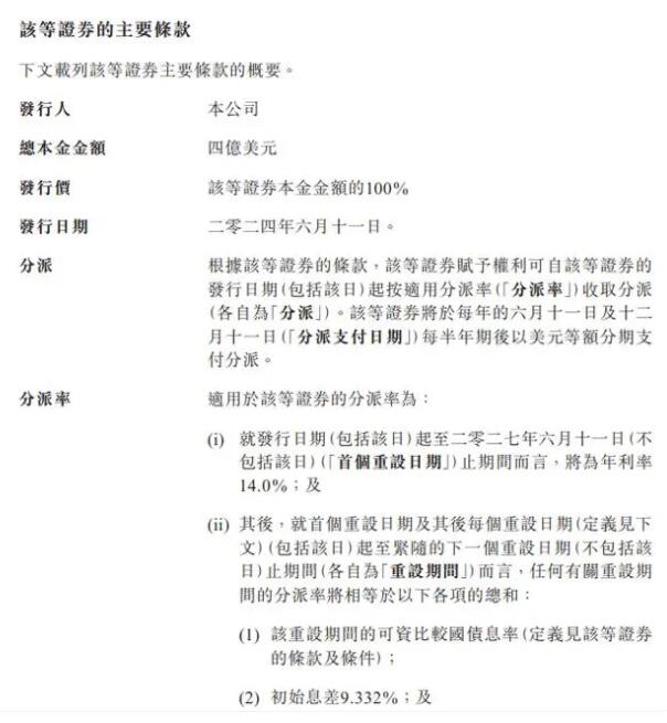 注:玖龍?jiān)旒堊?月17日以來(lái)的表現(xiàn) 根據(jù)公開(kāi)消息,玖龍紙業(yè)成立于1995年,總部位于中國(guó)廣東省東莞市,2006年于香港聯(lián)交所主板上市,目前為全球產(chǎn)能排名第一的造紙集團(tuán)和林漿紙一體化的龍頭企業(yè),主要產(chǎn)品為各類環(huán)保包裝紙、高檔全木漿紙及其上下游產(chǎn)業(yè)鏈。 該公司在本月3日發(fā)布一則公告引發(fā)市場(chǎng)關(guān)注。 據(jù)公告,玖龍紙業(yè)在6月3日正式與第三方發(fā)行機(jī)構(gòu)簽訂了一份證券發(fā)行協(xié)議,將發(fā)行一只總價(jià)4億美元的優(yōu)先永續(xù)資本證券,年利率為14%,期限為三年,即2024年6月11日至2027年6月11日。