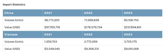 2024年6月25日,美國商務(wù)部發(fā)布公告,對進(jìn)口自中國和越南的紙盤(CertainPaperPlates)作出反補(bǔ)貼肯定性初裁,初步裁定: (1)中國企業(yè): 福州恒利紙業(yè)有限公司(FuzhouHengliPaperCo.,Ltd.)稅率為11.53%; 金華市達(dá)達(dá)紙塑制品有限公司(JinhuaP&PProductCo.,Ltd.)稅率為3.54%; 寧波創(chuàng)酷國際貿(mào)易有限公司(NingboArtcoolCo.,Ltd.);寧波奉化永發(fā)印務(wù)文具有限公司(NingboFenghuaYongfaPrintingStationeryCo.,Ltd.);浙江金晟環(huán)保股份有限公司(ZhejiangKingsunEco-PackCo.,Ltd.);浙江凌榮工藝品有限公司(ZhejiangLingrongCraftsCo.,Ltd.)因未配合應(yīng)訴,被適用313.14%的懲罰性稅率; 其他生產(chǎn)商/出口商的稅率為10.64%。 (2)越南企業(yè): Go-PakPaperProductsVietnamCo.,Ltd.稅率為5.48%; InnovativeSonicVietnamInternational、NingboChangyaPlasticVietnamCompany、NingboChangyaPlasticVietnam、SCGVietnam和XieLiVietnamInternationalCompanyLimited因未配合應(yīng)訴,被適用237.65%的懲罰性稅率; 其他生產(chǎn)商/出口商的稅率為為5.48%。 美國商務(wù)部預(yù)計(jì)將于2024年11月5日作出反補(bǔ)貼終裁。本案涉及美國海關(guān)編碼4823.69.0040項(xiàng)下產(chǎn)品。 2021-2023年,美國自中國和越南的紙盤的進(jìn)口量和進(jìn)口金額如下: