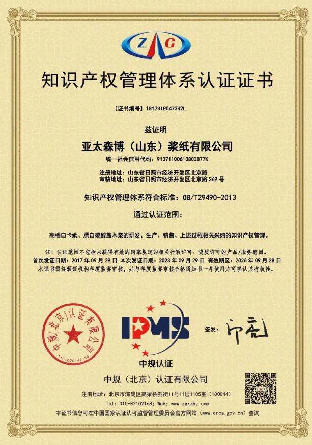 9月19日,亞太森博順利通過中規(北京)認證有限公司知識產權管理體系監督審核。中規北京認證指出,我公司知識產權管理體系有效實施、運行并持續改進,符合標準GB/T 29490-2013、體系文件和相關法律法規的要求,同時與企業經營發展相適應。