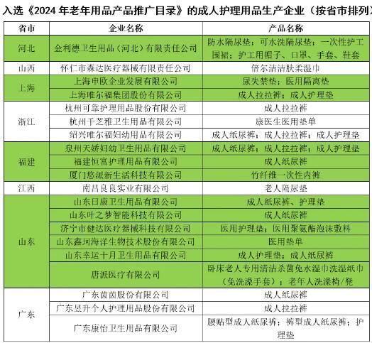 2024年9月25日,工業(yè)和信息化部正式公布了《2024年老年用品產(chǎn)品推廣目錄》。杭州可靠、杭州千芝雅、廣東康怡、泉州天嬌、上海唯爾福、金利德、上海申歐、福建恒富、山東日康、山東葉之夢、廣東茵茵、廣東昱升等20家成人紙尿褲、護理墊、濕巾和一次性內(nèi)褲生產(chǎn)企業(yè)成功入選,為優(yōu)質(zhì)成人護理用品樹立了典范。