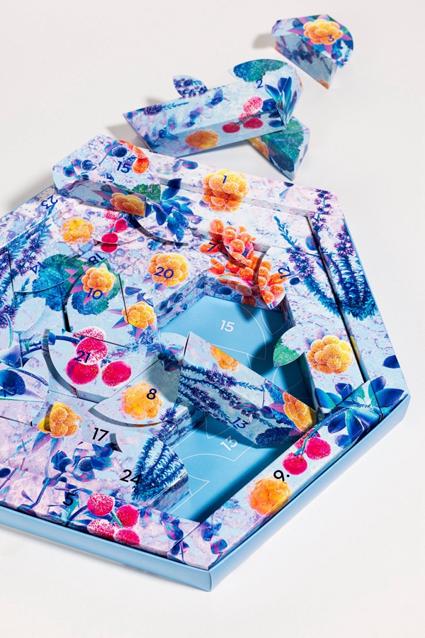 努米寧介紹說:“圣誕日歷禮盒的開口是由不同形狀的盒子拼接而成的,重復拼接后就形成了花朵圖案。這種新穎的結構使內部特別引人注目,而且易于生產(chǎn)。”