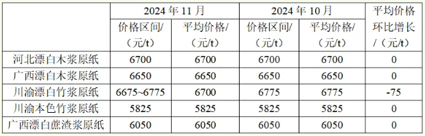 具體來看,木漿原紙中,河北漂白木漿原紙平均價格為6700元/t。廣西漂白木漿原紙平均價格為6650元/t,較10月均保持不變。