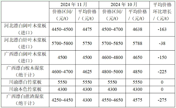 2024年11月紙漿價格變化情況具體如下,河北漂白闊葉木漿板(進口)平均價格下降163元/t,為4475元/t。河北漂白針葉木漿板(進口)平均價格下降38元/t,為5750元/t。廣西漂白闊葉木漿板(進口)平均價格下降150元/t,為4500元/t。廣西本地漂白桉木濕漿(絕干計)平均價格下降225元/t,為4625元/t。