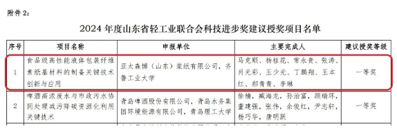 2024年12月24日,山東省輕工業聯合會公布了2024年度科學技術獎獲獎項目,公司“食品級高性能液體包裝纖維素紙基材料的制備關鍵技術創新與應用”項目榮獲2024年度山東省輕工業聯合會科技進步獎一等獎。