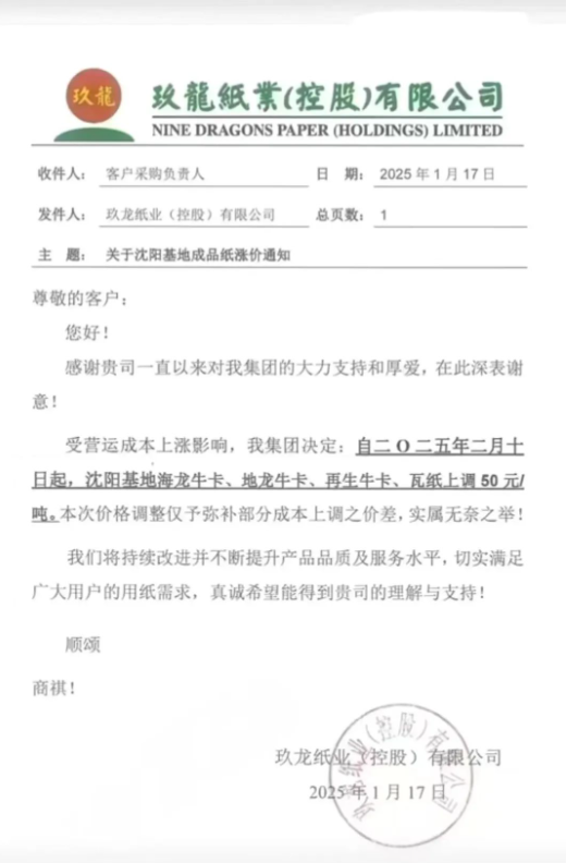 2025年1月17日,玖龍紙業(yè)位于北方的生產(chǎn)基地:天津、河北、沈陽玖龍宣布,將從2月10日起對原紙漲價,漲幅為50元/噸。具體如下↓