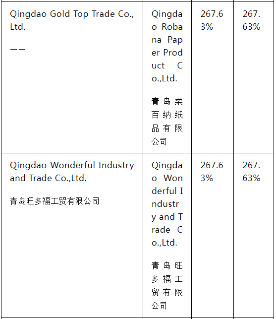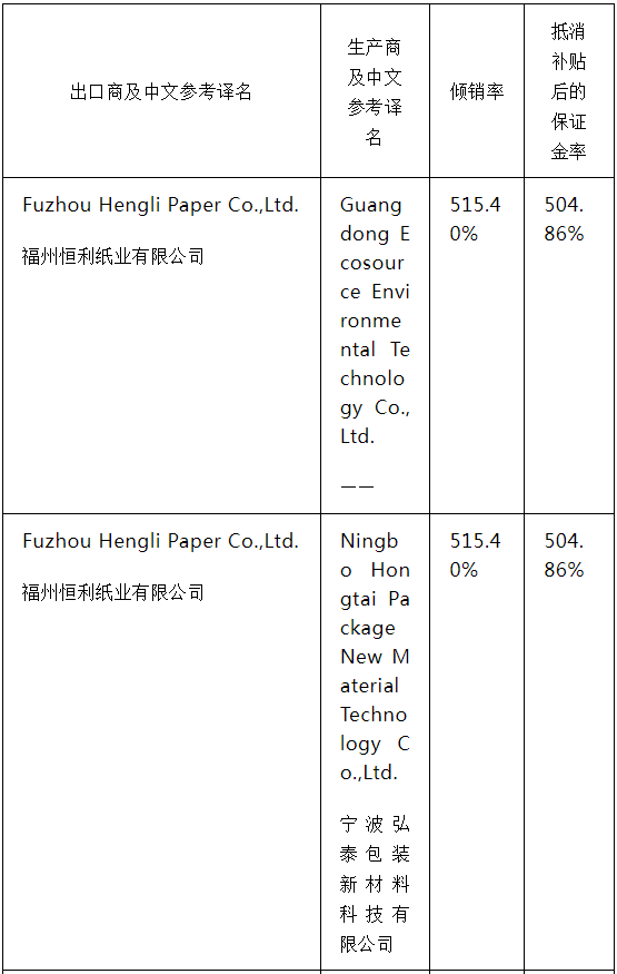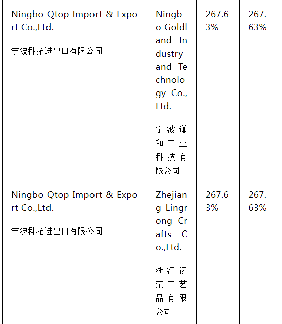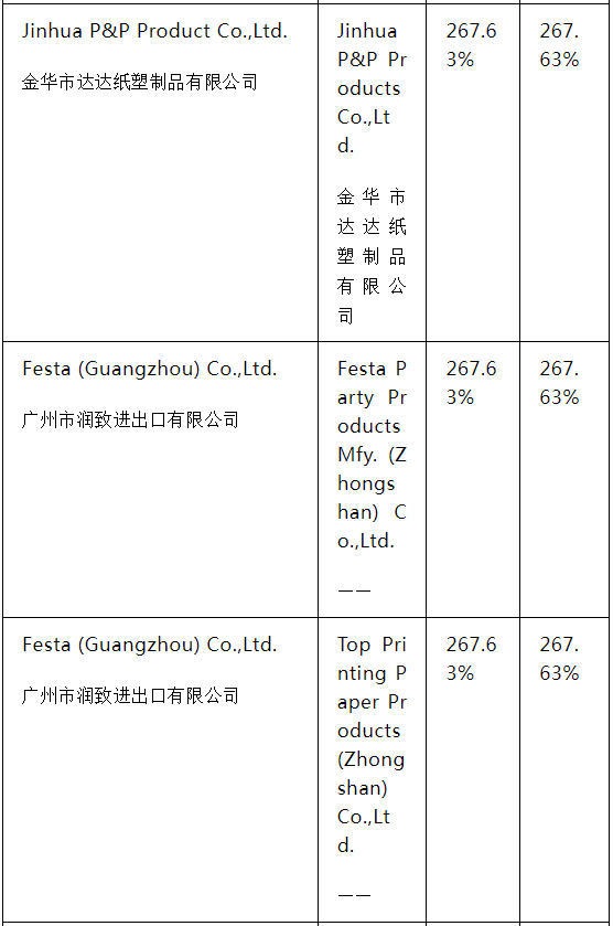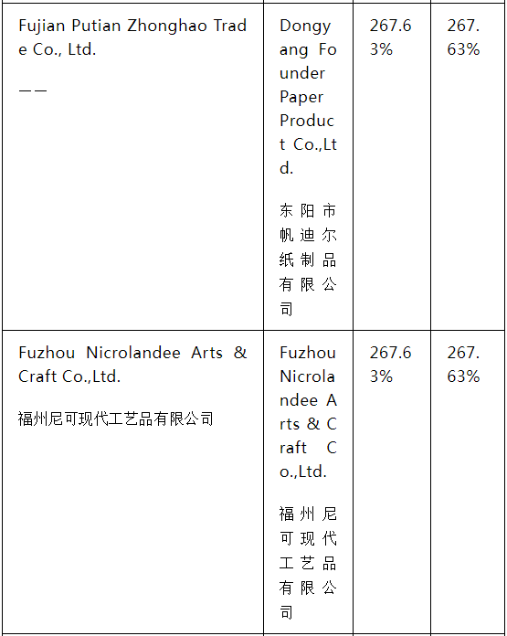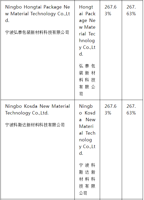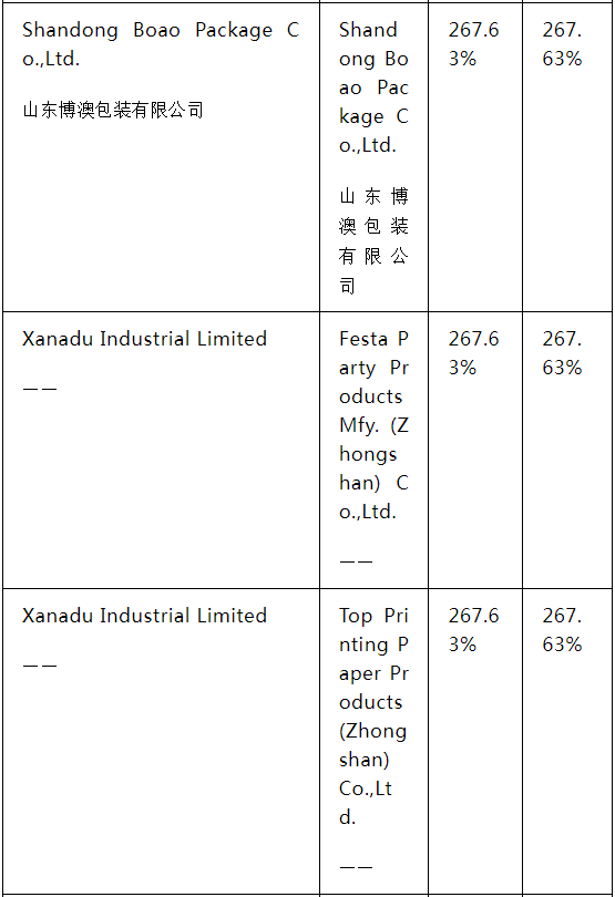 2025年1月22日,美國商務部對進口自中國、泰國和越南的紙盤(Paper Plates)作出反傾銷終裁,裁定中國生產商/出口商的傾銷率為267.63%—515.40%(抵消補貼后的保證金調整為267.63%—504.86%,具體稅率詳見下表)、泰國生產商/出口商的傾銷率為5.57%—73.17%、越南生產商/出口商的傾銷率為30.42%—165.27%(抵消補貼后的保證金調整為24.89%—159.74%)。同時,美國商務部對進口自中國和越南的紙盤作出反補貼肯定性終裁,裁定:福州恒利紙業有限公司(Fuzhou Hengli Paper Co., Ltd.)稅率為11.38%、金華市達達紙塑制品有限公司(Jinhua P&P Product Co., Ltd.)稅率為4.47%、寧波創酷國際貿易有限公司(Ningbo Artcool Co., Ltd.)、寧波奉化永發印務文具有限公司(Ningbo Fenghua Yongfa Printing Stationery Co., Ltd.)、浙江金晟環保股份有限公司 (Zhejiang Kingsun Eco-Pack Co., Ltd.)、浙江凌榮工藝品有限公司(Zhejiang Lingrong Crafts Co., Ltd.)因未配合應訴,被適用295.08%的懲罰性稅率、其他生產商/出口商的稅率為10.61%;越南生產商/出口商的稅率為5.53%—225.90%。美國國際貿易委員會(ITC)預計將于2025年3月7日對上述國家涉案產品作出反傾銷和反補貼產業損害終裁。本案涉及美國海關編碼4823.69.0040項下產品。 2024年2月15日,美國商務部宣布對進口自中國、泰國和越南的紙盤發起反傾銷調查,同時對進口自中國和越南的紙盤發起反補貼調查。2024年6月24日,美國商務部對進口自中國和越南的紙盤作出反補貼肯定性初裁。2024年8月29日,美國商務部對進口自中國、泰國和越南的紙盤作出反傾銷初裁。 中國出口商/生產商反傾銷稅率表:
