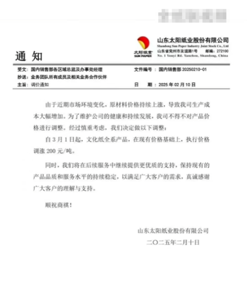 APP(中國)事業(yè)群·文化用紙內(nèi)貿(mào)銷售:由于原輔材料價格持續(xù)高位運行,我司原紙成本居高不下,為緩解營運壓力并為客戶穩(wěn)定提供高品質(zhì)的紙品和服務(wù),我司決定自2025年3月1日起,針對金東、金海所生產(chǎn)的銅版、非涂全系各紙種、克重紙品價格在 2025年2月基礎(chǔ)上調(diào)漲200 元/噸(含稅)。