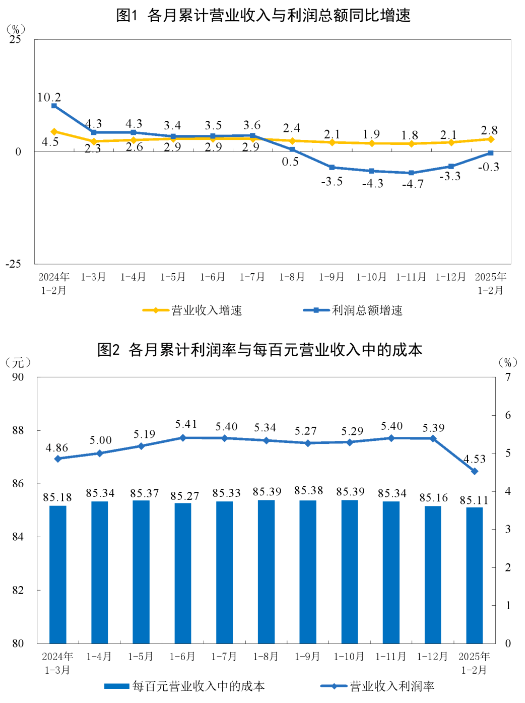 1—2月份,規模以上工業企業實現營業收入20.09萬億元,同比增長2.8%;發生營業成本17.10萬億元,增長2.9%;營業收入利潤率為4.53%,同比下降0.14個百分點。
