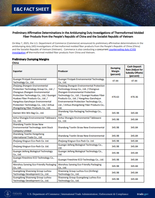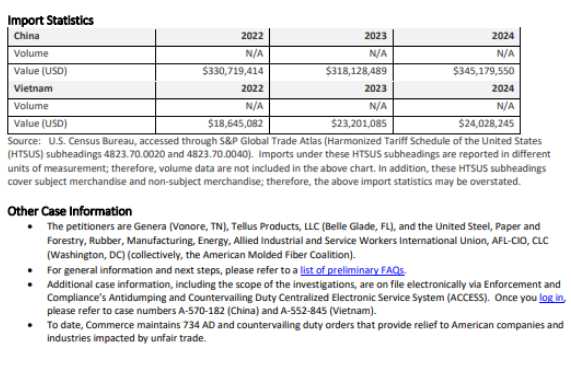 2025年5月7日,美國(guó)商務(wù)部(商務(wù)部)宣布了對(duì)來自中華人民共和國(guó)(中國(guó))和越南社會(huì)主義共和國(guó)(越南)的熱成型模壓纖維制品反傾銷稅(AD)調(diào)查的初步肯定性裁定。商務(wù)部還在同時(shí)對(duì)中國(guó)和越南的熱成型模壓纖維制品進(jìn)行反補(bǔ)貼稅(CVD)調(diào)查。
