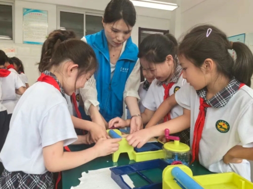 另外,為讓廣大青少年能親身體驗資源循環(huán)利用的神奇過程,亞太森博志愿者還帶來了“我是小小造紙家”體驗活動。只見孩子們在志愿者們的帶領(lǐng)下分工合作,將廢紙撕碎、打漿、鋪漿、壓榨、成型、烘干,隨后一張張新紙就制造了出來!霸瓉韽U紙真的可以回收利用啊!”孩子們不禁開心地歡呼道。