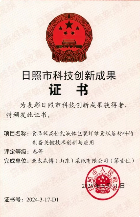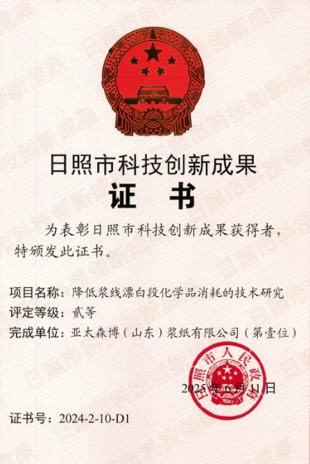 近日,亞太森博憑借在漿紙行業技術創新方面的成就,榮獲2024年度日照市科技成果創新獎兩項殊榮。其中,“降低漿線漂白段化學品消耗的技術研究”榮獲二等獎,“食品級高性能液體包裝纖維素紙基材料的制備關鍵技術創新與應用”榮獲三等獎。這一成績展現了公司在綠色制造、節能減排及高端紙基材料研發領域的領先實力。