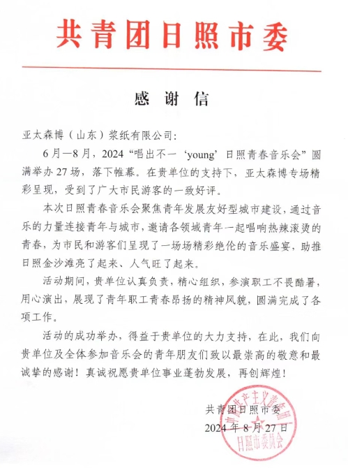 本次也是亞太森博優秀青年連續2年參加支持日照市青春公益演唱會活動。在2024年暑期,為助力日照文旅事業發展,市委宣傳部、團市委、市文化和旅游局聯合主辦了“日照青春音樂會”,其中亞太森博不僅舉辦了專場,同時還是作為最后一場壓軸登場。當時,亞太森博的廣大優秀青年傾情演繹,為游客們獻上了一場精彩紛呈的音樂盛宴,獲得了一致好評,共青團日照市委專門發來感謝信。