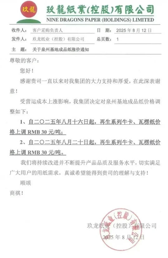 再看山鷹紙業,8月12日宣布華中基地于8月15日上漲,福建基地、廣東基地的多個紙種將在8月16日上漲;8月14日,山鷹紙業再度發函,宣布浙江基地、安徽基地多個紙種將上漲30-50元/噸。 原紙漲價“沒完沒了”,下游紙板行業成本急劇上升,有企業稱“受原材料持續上漲影響,公司資金壓力不斷增加”。為緩解價格壓力,廣東、浙江、河南等多地紙板廠紛紛發布漲價函,同時對訂單交期作出限制。 毫無疑問,在這個8月份,原紙、紙板漲價函正在來襲! 部分紙板漲價函 商丘市聯諾包裝有限公司 自8月15日起,二層每平方上調0.02元,三層每平方上調0.03元,四層、五層每平方上調0.05元。 鶴山市勝源紙品有限公司 自8月14日20點起,三層紙板價格上調5分,四層及五層紙板價格上調8分。 浙江國立包裝限公司 自8月13日起,三層紙板上調0.05元/平方米,四層紙板上調0.10元/平方米,五層紙板上調0.10元/平方米。 蘭溪市錢村福利包裝廠 自8月12日起,五層上調0.05元/單平方,三層上調0.03元/單平方。 浙江浪莎包裝 自8月12日12點起,三層上調0.03元/平方,四、五層上調0.05元/平方。 浦江豐愷包裝有限公司 自8月12日下午17:00起,三層上調0.03元/單平方,五層上調0.05元/單平方,七層上調0.08元/單平方。 浙江松格紙制品有限公司 自8月12日起,三層紙板上調0.03元/單平方,五層紙板上調0.05元/單平方,七層紙板上調0.10元/單平方。