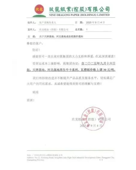 在目前的銷售價格基礎上,從2025年9月12日起,我公司生產的再生牛卡/高強瓦楞紙銷售價格上調30元/噸。