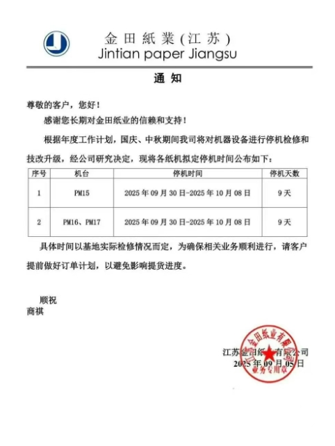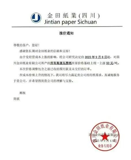 自2025年9月8日起,對四川金田紙業有限公司所產的所有高強瓦楞紙在原價格基礎上統一上漲50元/噸。