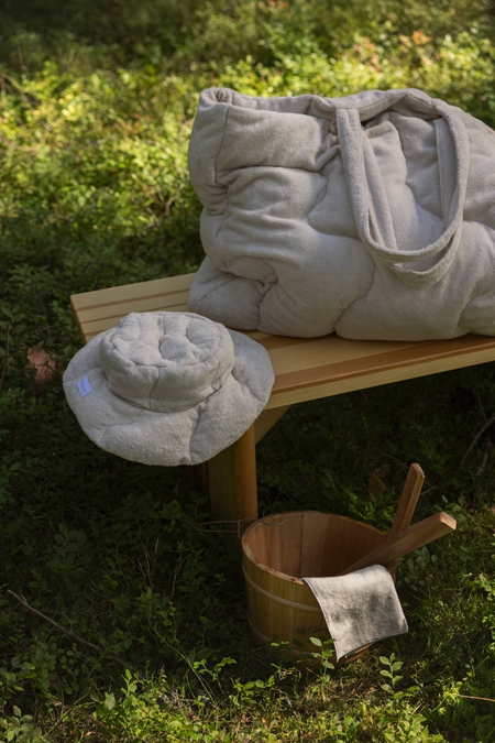 維爾塔寧表示:“木材的氣味和質感與桑拿體驗密切相關,因此使用木質纖維來設計桑拿專用服飾是非常自然的選擇。通過這個系列,我希望強調服飾和紡織品在快節奏生活中幫助人們放松的重要作用。” Kuura既可用作服飾面料,也可作填充材料。在面料成分中,Kuura占比30%,棉花占比70%。該服飾的設計靈感源自自然形態:縫線圖案基于艾內科斯基的地形,邊緣流蘇則模仿胡須地衣的形態。 “我希望打造多功能服飾,例如桑拿包可作為枕頭或坐墊使用,裙子可展開作為毛巾,夾克既可作浴袍,也適合外出穿搭。” 維爾塔寧補充道。