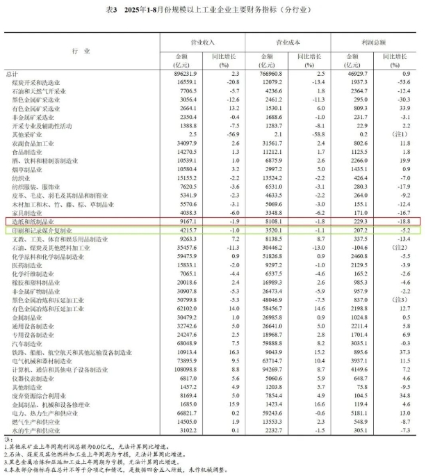 1—8月份,規模以上工業企業實現營業收入89.62萬億元,同比增長2.3%;發生營業成本76.70萬億元,增長2.5%;營業收入利潤率為5.24%,同比下降0.06個百分點。其中,造紙和紙制品業實現營業收入9167.1億元,同比下降1.9%;印刷和記錄媒介復制業實現營業收入4215.7億元,同比下降1.0%。 8月末,規模以上工業企業資產總計185.08萬億元,同比增長5.0%;負債合計107.34萬億元,增長5.4%;所有者權益合計77.73萬億元,增長4.4%;資產負債率為58.0%,同比上升0.2個百分點。 8月末,規模以上工業企業應收賬款27.24萬億元,同比增長6.6%;產成品存貨6.73萬億元,增長2.3%。 1—8月份,規模以上工業企業每百元營業收入中的成本為85.58元,同比增加0.19元;每百元營業收入中的費用為8.37元,同比減少0.08元。 8月末,規模以上工業企業每百元資產實現的營業收入為74.0元,同比減少2.0元;人均營業收入為183.5萬元,同比增加5.7萬元;產成品存貨周轉天數為20.5天,同比增加0.1天;應收賬款平均回收期為70.1天,同比增加3.7天。 8月份,規模以上工業企業利潤同比由上月下降1.5%轉為增長20.4%。 國家統計局工業司首席統計師于衛寧解讀2025年1—8月份工業企業利潤數據表示,1—8月份,在宏觀政策發力顯效、全國統一大市場縱深推進,疊加去年同期低基數等多重因素作用下,規模以上工業企業利潤同比增長0.9%,裝備制造業支撐有力,不同規模企業利潤均有所改善。工業企業利潤明顯改善;工業企業營收保持穩定增長;裝備制造業“壓艙石”作用明顯;原材料制造業利潤增長較快,消費品制造業利潤由降轉增;不同規模企業利潤均有改善,私營企業利潤明顯加快;8月企業單位成本下降,營收利潤率回升。