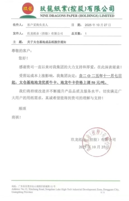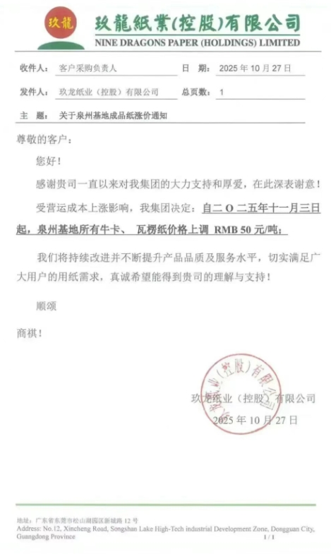 隨著玖龍、山鷹等龍頭紙企率先上調(diào)原紙價(jià)格,新一輪漲價(jià)潮已拉開(kāi)序幕。各地紙企緊隨其后,陸續(xù)發(fā)布調(diào)價(jià)函,漲價(jià)壓力正逐步向下游傳導(dǎo)。 • 玖龍泉州基地 自十一月三日起,泉州基地所有?、瓦楞紙價(jià)格上調(diào) RMB 50 元/噸。
