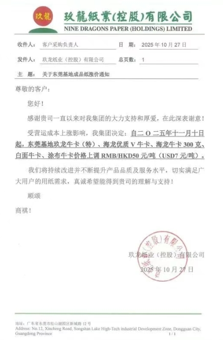 • 玖龍東莞基地 自十一月十日起,東莞基地玖龍?(特)、海龍優(yōu)質(zhì)V?、海龍牛卡300克、白面?、涂布牛卡價(jià)格上調(diào)RMB/HKD50元/噸(USD7元/噸)。